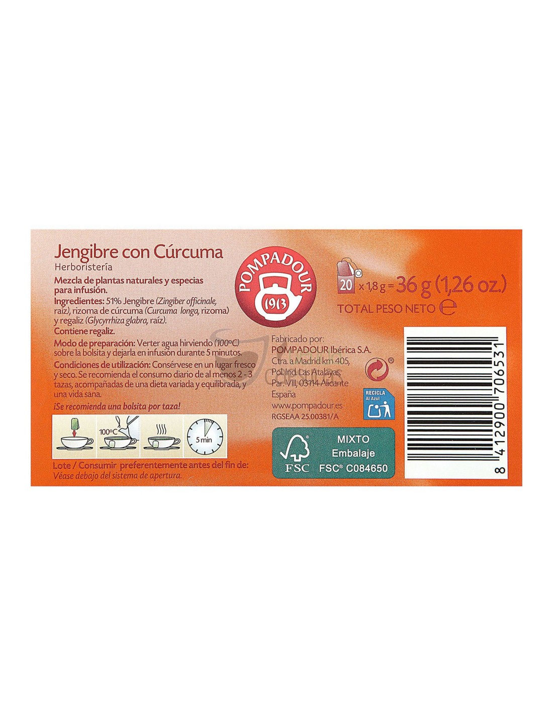 Ingredientes: 51% Jengibre (Zingiber officinale, raiz), rizoma de cúrcuma (Curcuma longa, rizoma) y regaliz (Glycyrrhiza glabra, raíz). Contiene regaliz.